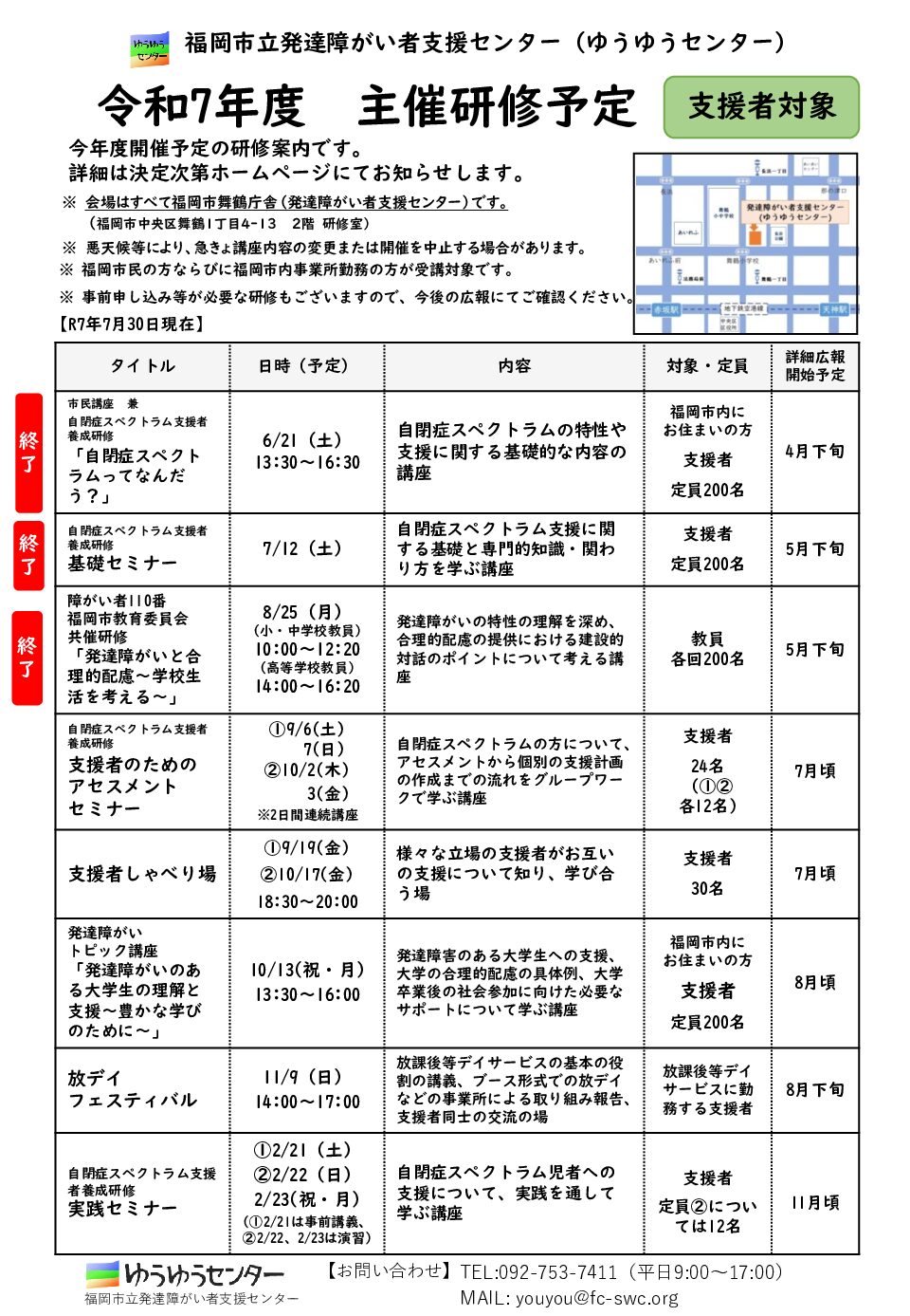 令和7年度の支援者を対象とした主催研修予定(令和7年9月18日時点のもの)をご案内いたします(上方をクリックするとPDFが開きます)。なお、各研修の詳細は改めてお知らせいたしますので、今後の広報にてご確認くださいますようお願いいたします。