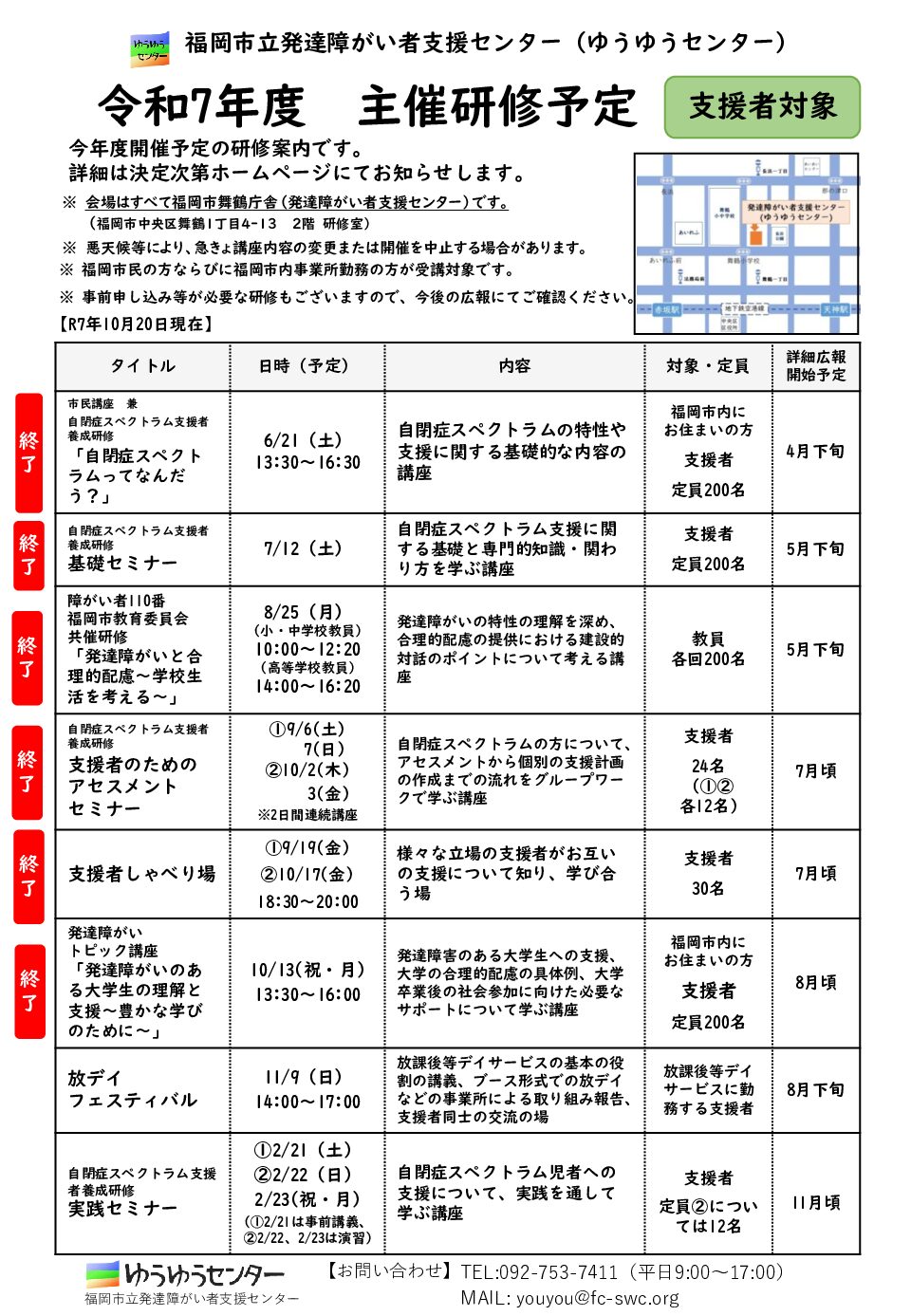 令和7年度の支援者を対象とした主催研修予定(令和7年10月20日時点のもの)をご案内いたします(上方をクリックするとPDFが開きます)。なお、各研修の詳細は改めてお知らせいたしますので、今後の広報にてご確認くださいますようお願いいたします。