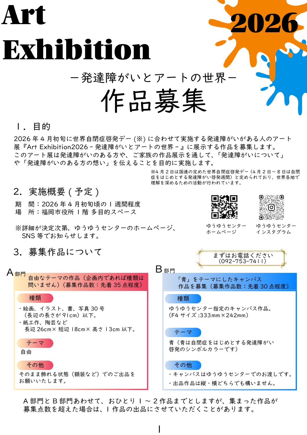 お知らせ発達障がいがある人のアート展「Art Exhibition 2026 -発達障がいとアートの世界-」開催にあたり、作品を募集いたします。応募にあたっての注意事項について、詳細は上方のチラシをクリックするとPDFが開きますので、ご確認ください。