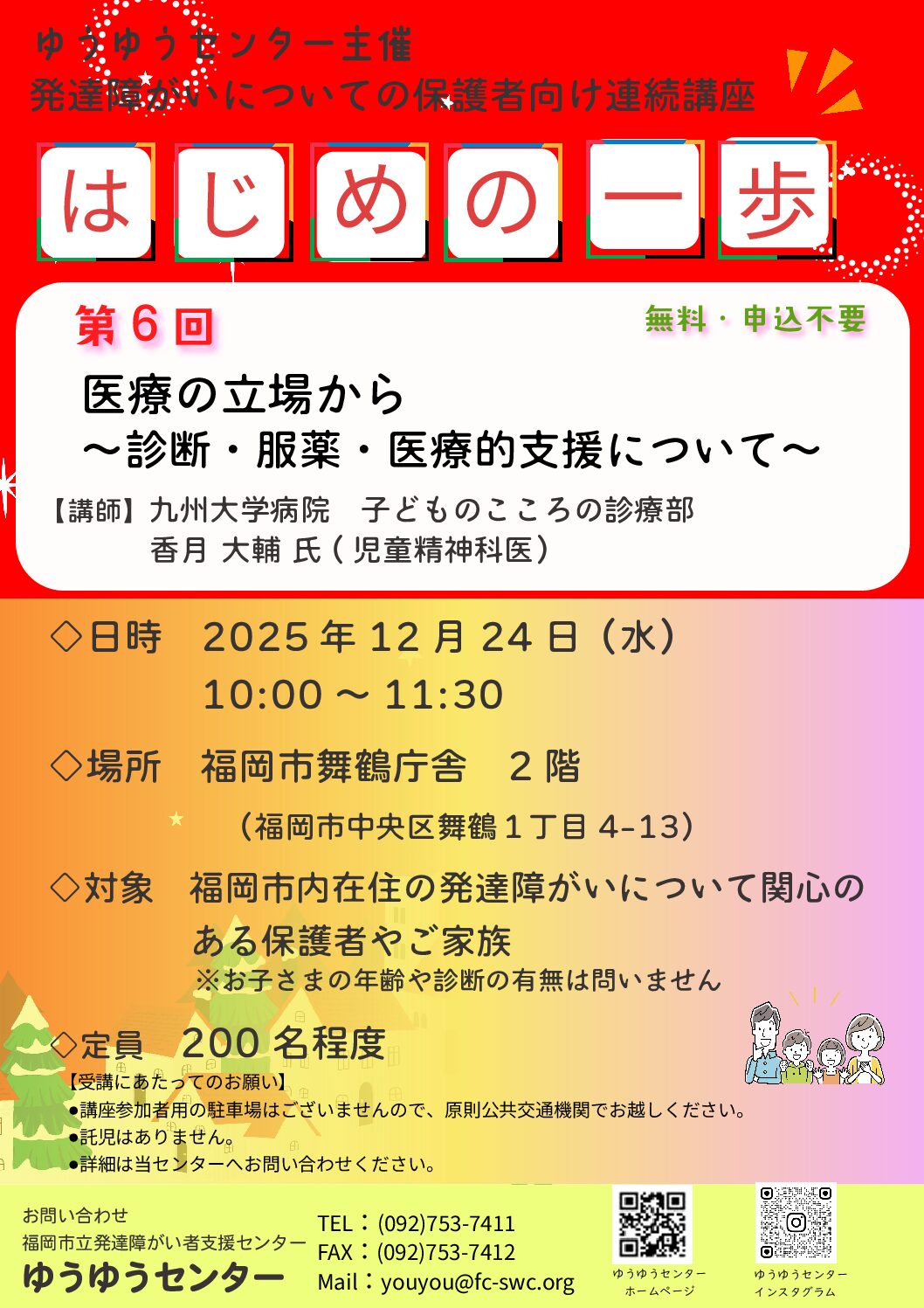 発達障がいがある方、発達障がいではないかと思われる方の保護者向け連続講座です。全7回シリーズの第6回目を行います。「医療の立場から~診断・服薬・医療的支援について~」をテーマに九州大学病院 子どものこころの診療部の香月先生が講演します。上記のPDFファイルをクリックすると詳細のチラシが開きます。