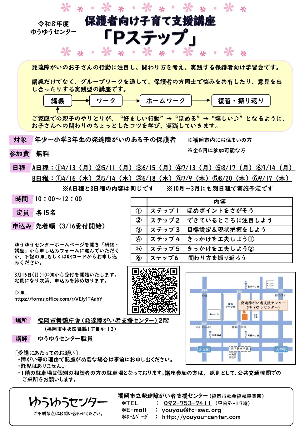 お知らせ福岡市内にお住まいの年少から小学3年生までの発達障がいのあるお子さんの保護者を対象とした学習会です。講座は全6回シリーズで、講義だけではなく、グループワークを通して、保護者同士で悩みを共有したり、意見を出し合ったりする実践型の講座です。上方のPDFファイルをクリックすると詳細のチラシが開きます。