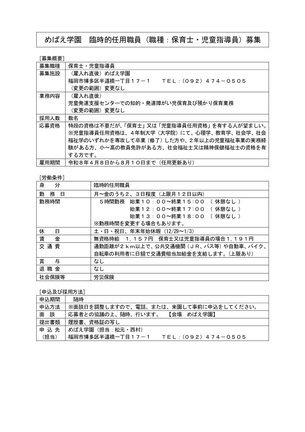 臨時的任用職員(職種:保育士・児童指導員)募集