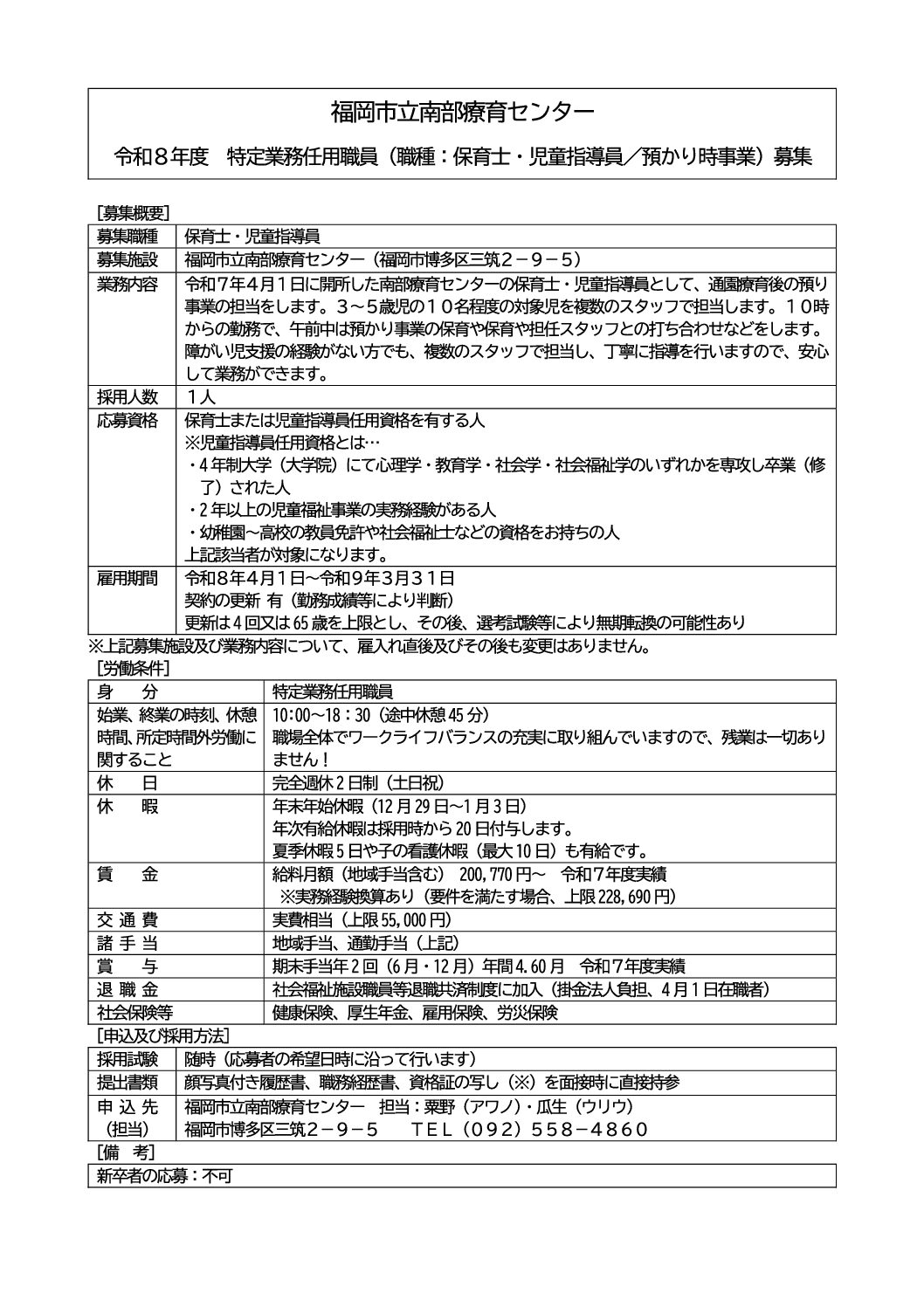 令和8年度 特定業務任用職員(保育士・児童指導員/預かり事業)南部療育センター