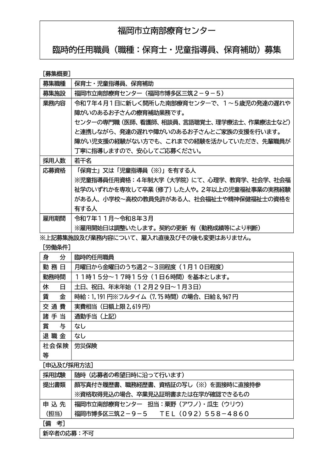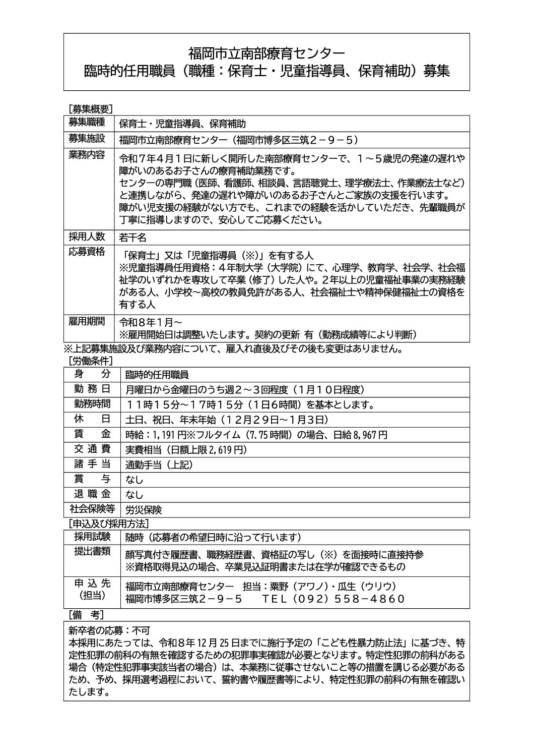 臨時的任用職員(保育士・児童指導員)南部療育センター