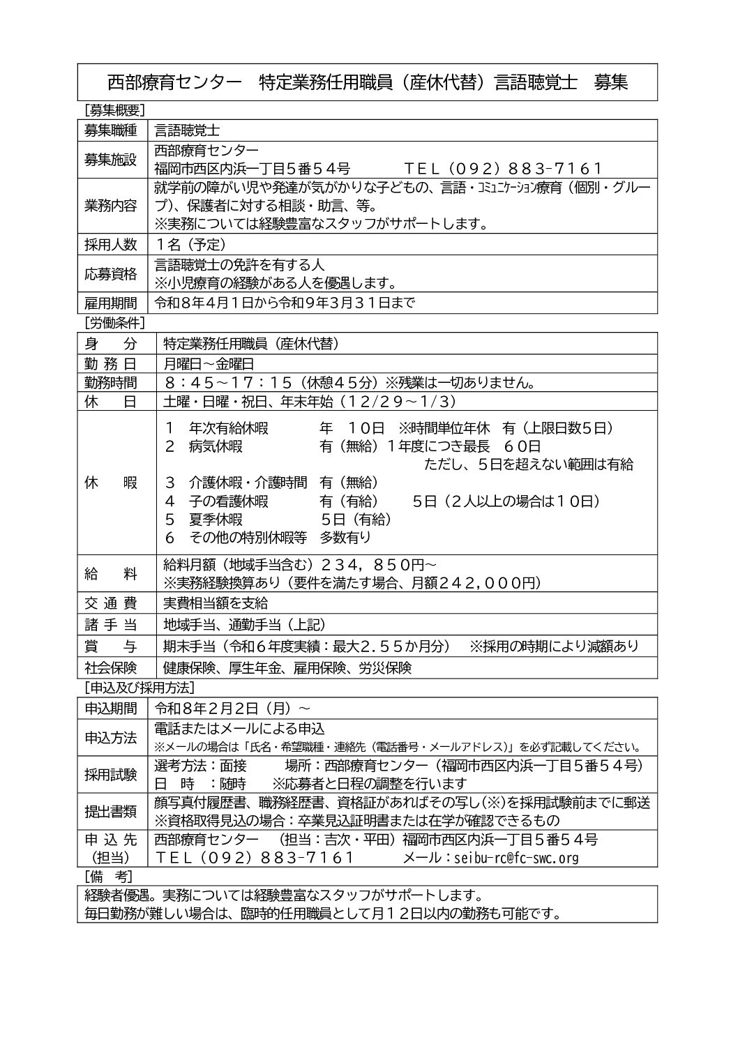 言語聴覚士募集(育休代替・特定業務任用職員)